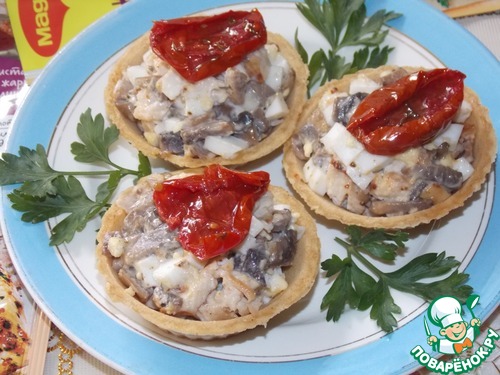 Посолить и поперчить по вкусу, перемешать. Выложить салат в тарталетки и украсить вялеными томатами.