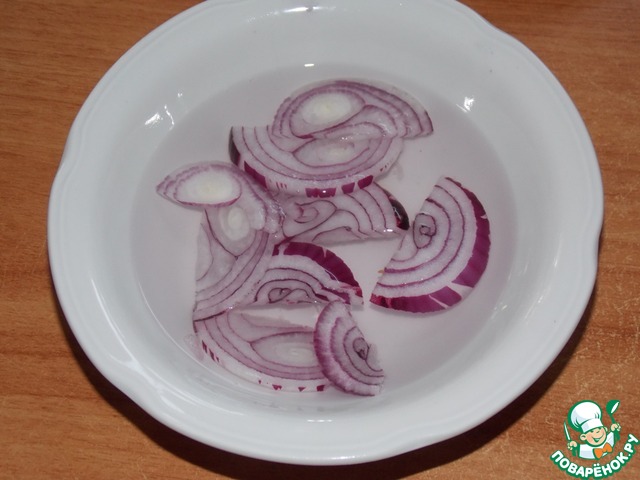 Лук нарезать и залить водой, добавить уксус. Оставить на 10 минут, затем воду слить.