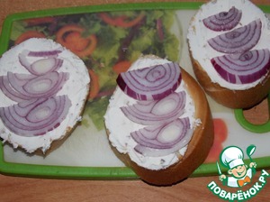 На каждый кусочек батона намазать по 1ст. л. творожного сыра, разложить лук.