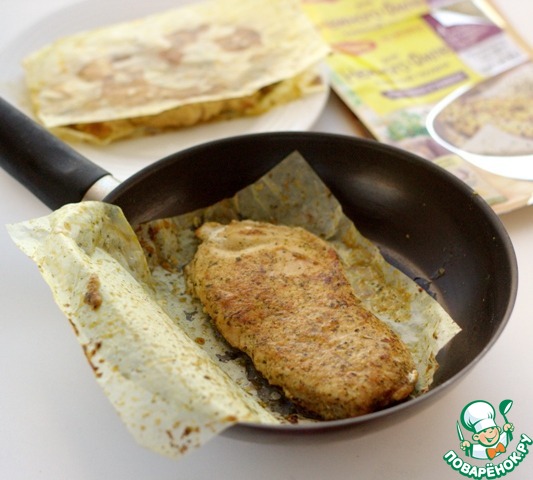 На одну половину листа для жарки от Магги выложить куриную грудку, прикрыть второй половиной листа, прижать рукой и готовить на разогретой сковороде без добавления масла по 5-7 минут с каждой стороны.