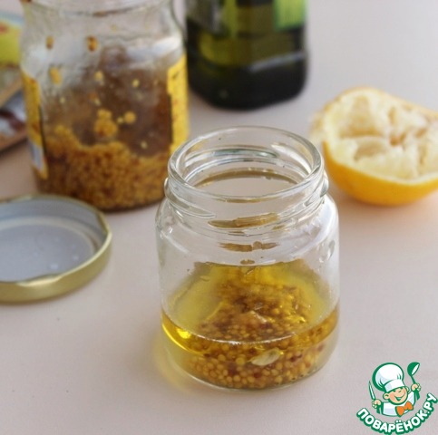 Приготовить заправку для салата. В баночке смешать 2 ст. л оливкового масла, 1 ст. л. зернистой горчицы, 1 ст. л. лимонного сока, баночку закрыть крышкой, потрясти.