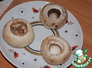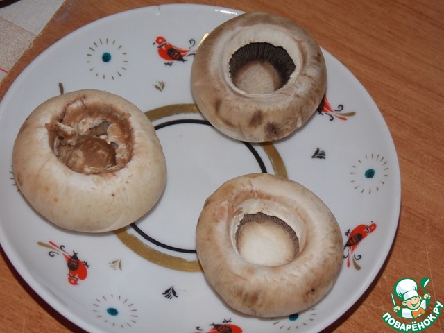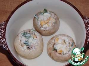 Выложить начинку в грибы. Запечь в смазанной маслом форме примерно 20 минут.