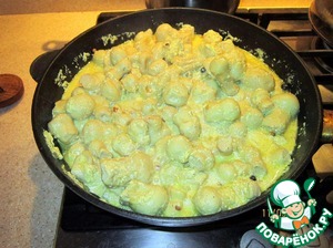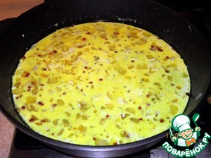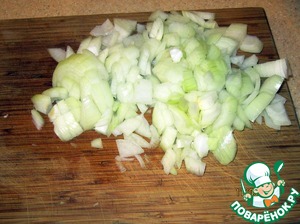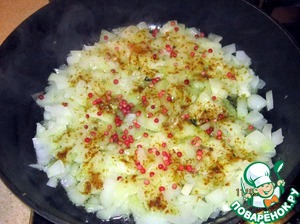 Обжариваем лук в 100 мл. растительного масла 3-5 минут на среднем огне, добавляем 1 ч. л. розового перца и 0,5 ч. л. куркумы.