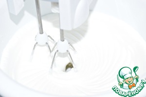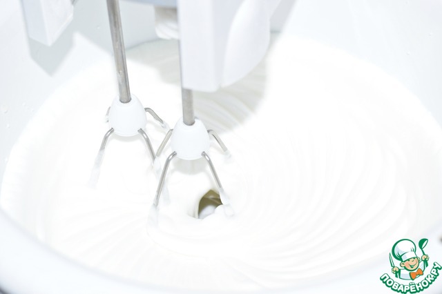 • Пока масло остывает взбить белки с сахарной пудрой в пышную, устойчивую пену.