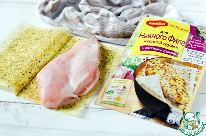 • Для этого рецепта нам понадобится MAGGI на второе "Для нежного филе куриной грудки с чесноком и травами". Куриную грудку отбить и аккуратно положить на лист для жарки от Магги.