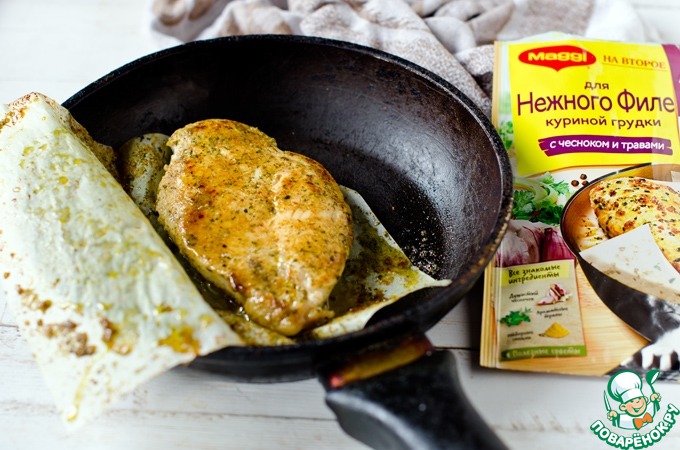 • На сухую сковороду положить грудку и обжаривать на медленном огне с каждой стороны до румяности. Честно скажу мне очень понравились листы для жарки от Магги, грудка получается очень нежная и сочная, насколько я не любила грудку, настолько я ее полюбила после приготовления с помощью Магги.