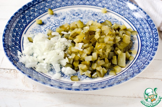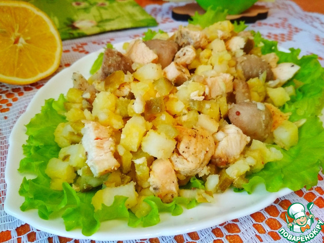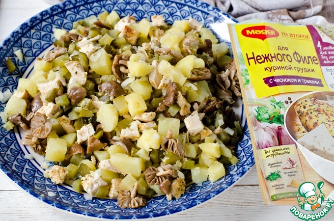 • Картофель отварить в мундире и порезать кубиками. То же самое сделать с грудкой, добавить к остальным ингредиентам, перемешать.