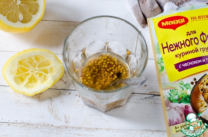 • Для приготовления заправки, смешать лимонный сок, дижонскую горчицу и растительное масло.