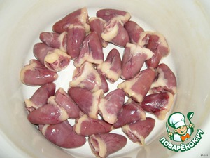 Сердечки очистить и помыть, сложить в кастрюлю. Залить 1,5 л воды и варить 40 мин.