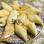 На праздничный стол я всегда подаю фаршированные блинчики, с разнообразными начинками. Сегодня пикантная куриная грудка в листах от Магги и творожное зерно в сливках - нежно, вкусно, празднично. Угощайтесь.