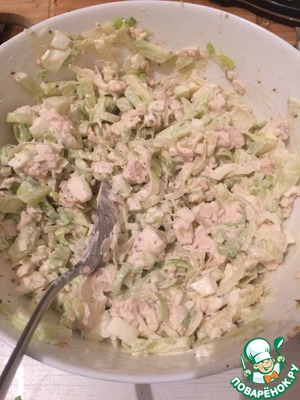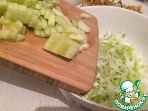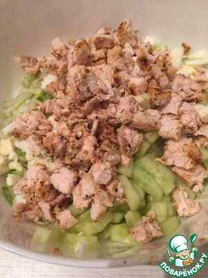 Жареное филе нарезать кубиками, а лучше брусочками. Все ингредиенты смешать в салатнике.