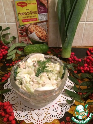 Быстрый салат с луком-пореем и жареным куриным филе.
