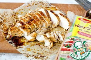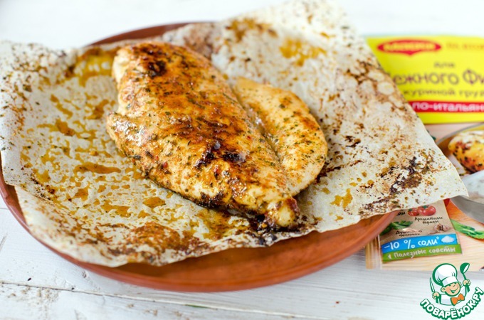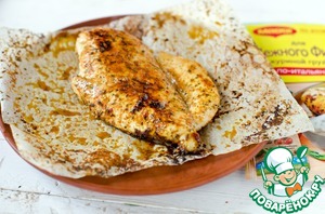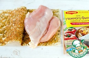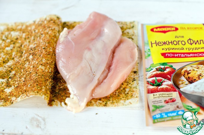 Для этого рецепта нам понадобится приправа Магги для нежного филе куриной грудки по-итальянски. Куриную грудку отбить и положить на одну половину листа для жарки и аккуратно накрыть второй половиной.