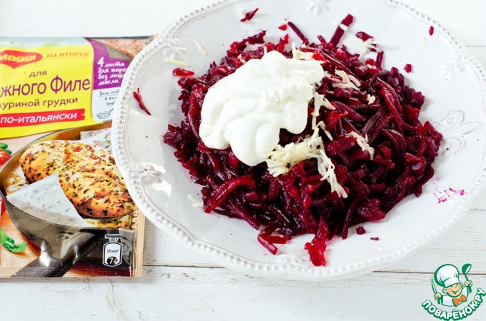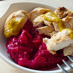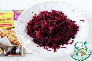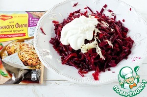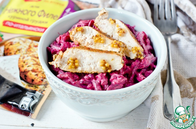 Перемешать свеклу, положить ее в салатник, сверху положить куриную грудку, добавить немного дижонской горчицы.