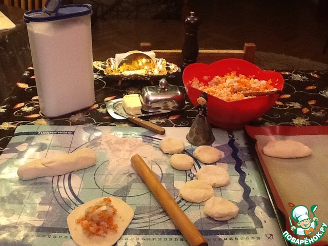 Тесто раскатываем не очень тонко. Выкладываем начинку и не забываем в каждый пирожок добавить маленький кусочек сливочного масла. Защипываем тщательно края.