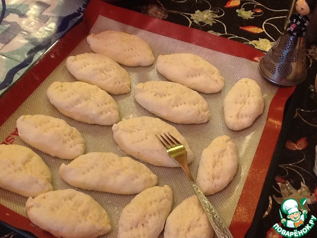 Вилкой чуть проколоть пирожки. В разогретую духовку поставить лист с пирожками. Температуру выставить среднюю, выпекать минут 20-30, до чуть золотистого цвета. Уже готовые и горячие пирожки накройте полотенцем и обмотайте целлофановым пакетом. Через минут 30-40 угощайтесь.