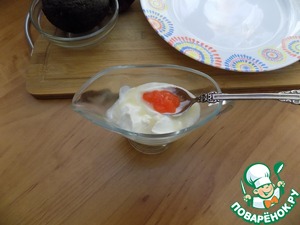 Берём большую тарелку или блюдо. Я взяла тарелку D-24 см. Выкладываем слоем авокадо и сразу промазываем его всей заправкой, чтобы оно не потемнело. -