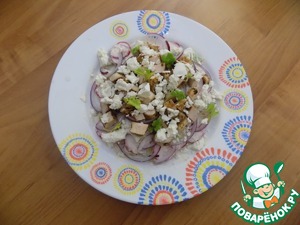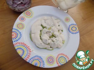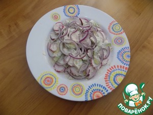 С лука сливаем воду и выкладываем тонкие полукольца поверх авокадо и редиса.