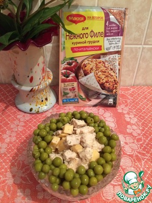 Минимум ингредиентов :курица, сыр, зелёный горошек и заправка-сытная закуска обеспечена.