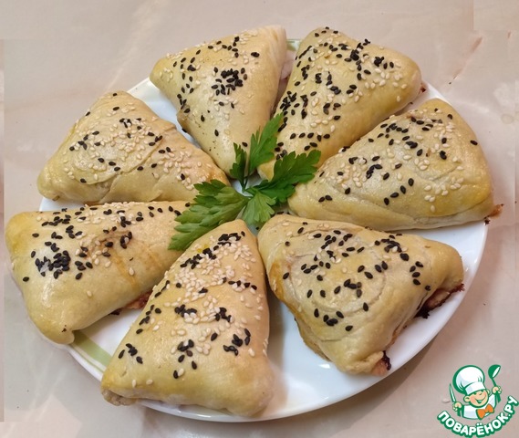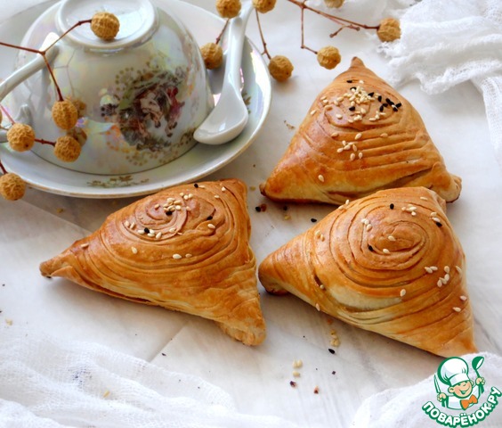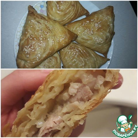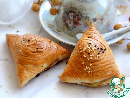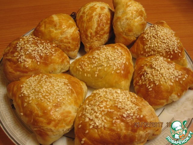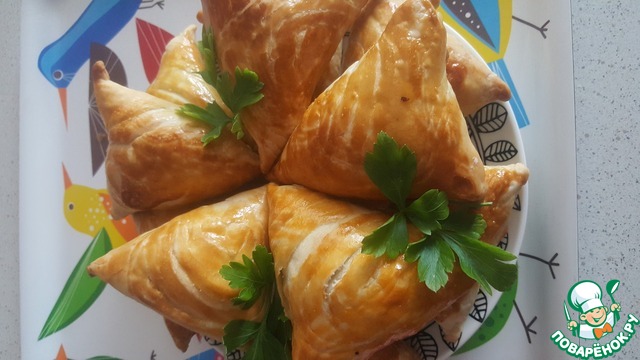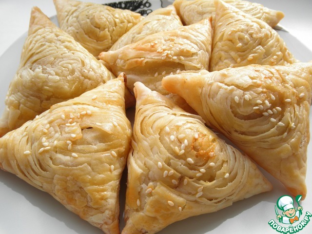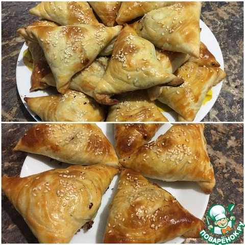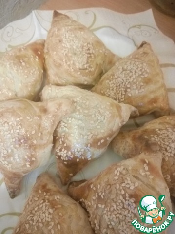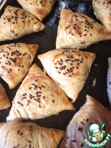 Выпекайте в заранее разогретой духовке при температуре -200 градусов 30 минут. Слоёную самсу можно подать как горячую закуску или к супу
