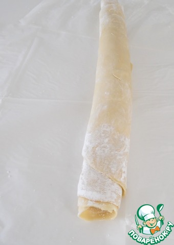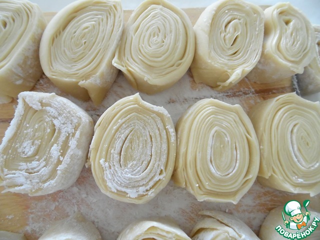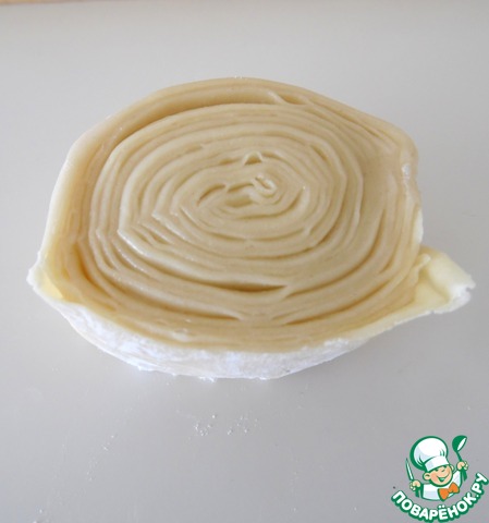 Выньте из холодильника кусочки подготовленного для самсы теста, Каждый кусочек теста поставьте на срез и, прижимая, придайте форму лепёшечки раскатайте каждый кусочек круглый пласт не очень тонкий иначе слои будут не видны