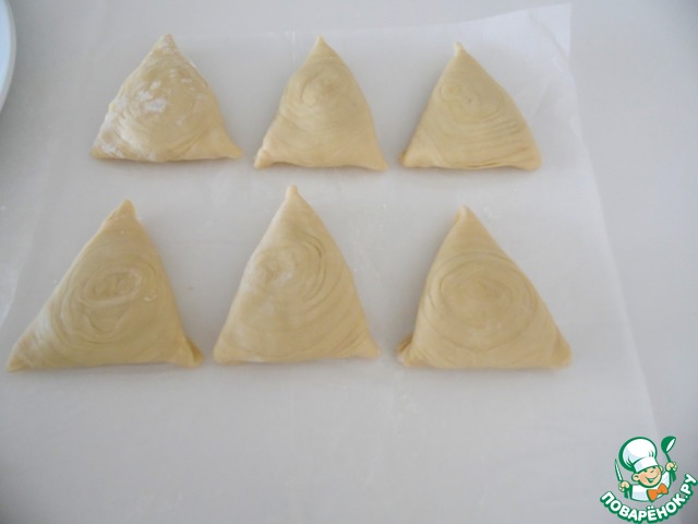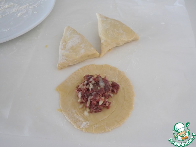 На середину каждого кружочка положите фарш, Поочередно поднимите тесто с трёх сторон на фарш, накладывая края теста друг на друга, придайте самсе треугольную форму, уголочки дополнительно загните и прижмите