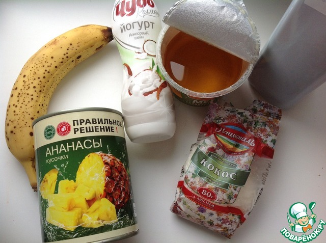 Ананас и банан желательно предварительно заморозить. В чашу блендера добавить банан, ананас и полстакана кокосового йогурта, смешать до пюреобразного состояния. Затем добавить остальные ингредиенты и смешать на высокой скорости до однородной массы. Если нет кокосового молока или йогурта, замените на обычное, вкус будет, конечно же не тот, но все равно вкусно. Для взрослых можно добавить кокосовый ликёр.