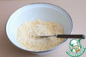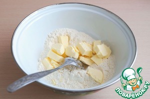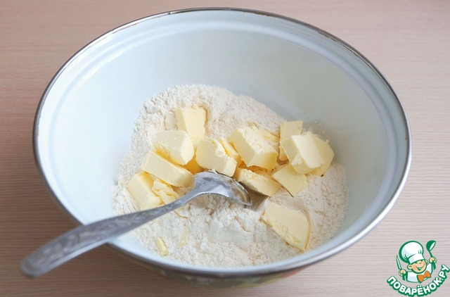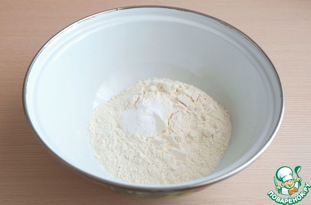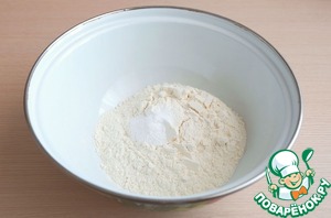 В миске соединить муку (170 гр.) и соду (1/ ч. ложки)