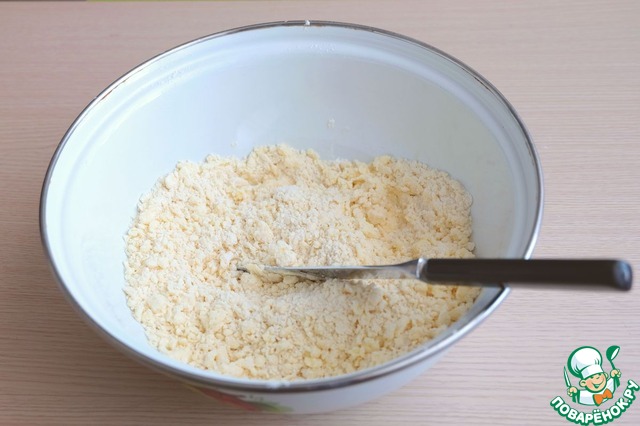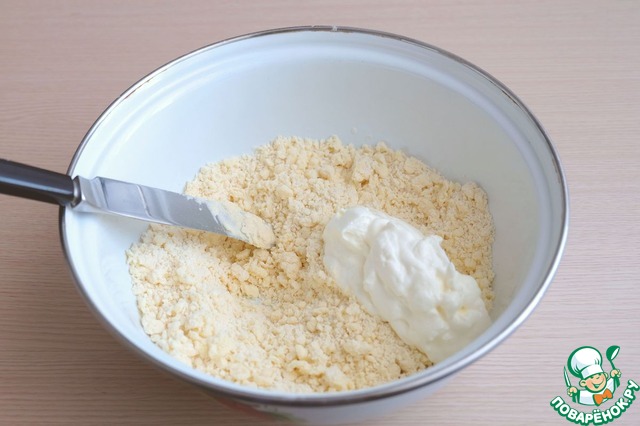 Добавить 2 ст. ложки сметаны. Замесить тесто. Завернуть тесто в пищевую пленку и отправить в холодильник на 30 мин.