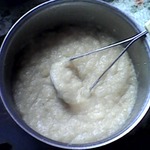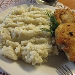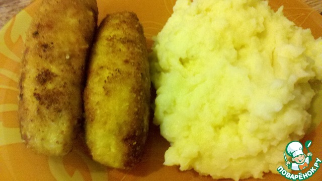 Отобрать 1 - 1, 5 стакана картофельного отвара, вытащить лавровый лист и перец душистый. Растолочь картофель в пюре. Мы любим чтобы пюре было не сильно крутым, поэтому я добавляю отвар до нужной консистенции пюре.