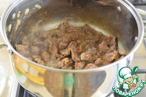 Добавить мясо и, периодически помешивая, обжарить до румяной корочки. Не пережарьте! Крышкой не накрываем.