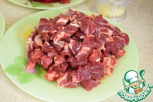 Мясо очистить от пленок и мелко порезать (примерно 1 х 1 см).