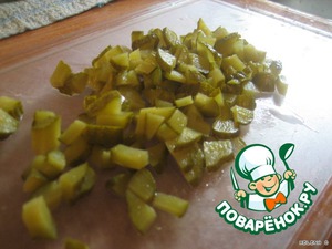 Измельчаем огурчики и после того, как мяско подрумянилось, добавляем их