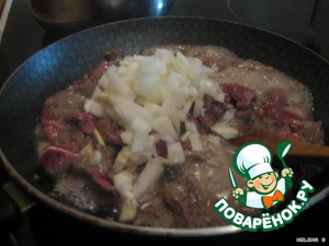 • Измельчаем репчатый лук и обжариваем вместе с мясом