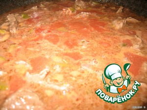 В кипяченую воду добавляем наши приправы, выдавить чеснок, томатную пасту и понемножку добавляем муки, чтобы было без комков