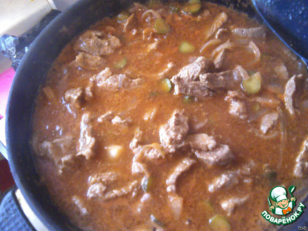 Заливаем мясо и тушим под крышкой на маленьком огне ещё минут 15