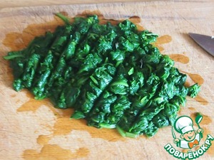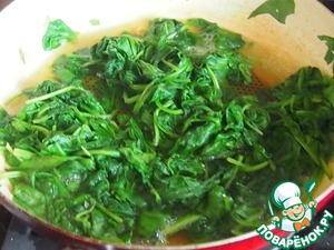 На сковороде закипятить одну ложку воды, добавить шпинат и, посмешивая, нагревать его до того, пока он уменьшит свой объем и как бы "завянет".