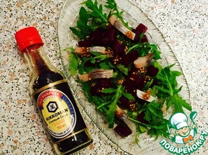 Свежий взгляд на салат со свеклой и селедкой. Простые ингредиенты, быстрота приготовления и яркий, запоминающийся вкус. Зерна горчицы оттеняют ореховый вкус рукколы, соленая сельдь отлично гармонирует со сладкой свеклой, соевый соус добавляет пикантности и законченности блюду