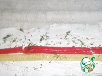 На край лаваша нанести, с помощью ложки, творожный сыр. Ширину выбирайте исходя из того, какой диаметр ролла хотите. |