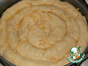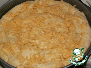 Сверху пирог смазать яйцом и посыпать тертым сыром.
