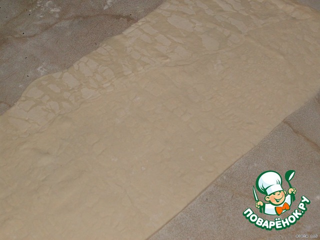 Тесто разморозить, на припорошенном мукой столе раскатать тесто в прямоугольный пласт.