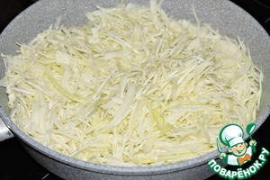 Капусту нарезать тонкой соломкой. В глубокой сковороде хорошо разогреть растительное масло (4 ст. л) и выложить в нее капусту. Жарить капусту на довольно сильном огне, помешивая, чтобы не подгорела. Крышкой сковороду не прикрывать. -