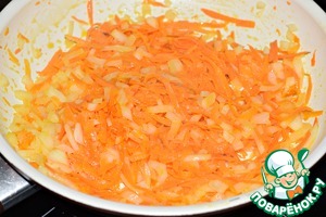 Пока капуста жарится, на другой сковороде обжарить в растительном масле (1 ст. л) мелко нарезанный лук и натертую на крупной терке морковь до мягкости.