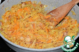 Добавить к капусте обжаренные лук и морковь с беконом, приправить паприкой (в идеале нужна копченая паприка, но обычная сладкая тоже пойдет), тщательно перемешать начинку. Попробовать на соль и при необходимости посолить. (бекон довольно соленый продукт, поэтому будьте с солью аккуратны)