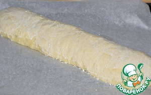 На рабочую поверхность, присыпанную мукой, выложить тесто, обмять его. Раскатать в пласт толщиной 0,5 см.