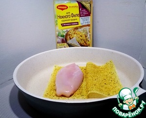 На сухую сковороду выкладываем в виде книжки лист для жарки. Куриное филе необходимо отбить до толщины в 1,5 см (максимум 2 см), уложить на первую "страничку", а второй - накрыть и прижать.