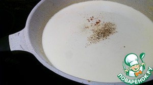 В той сковороде, в которой жарилась курица, осталось некоторое количество масла со специями (если у Вас ничего не останется, добавьте немного масла, можно сливочного), поэтому там же можно слегка обжарить муку, влить молоко и, помешивая, довести до загустения. Можно добавить мускатный орех, соль, перец по вкусу.