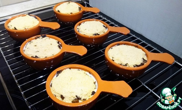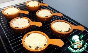 В кокотницы выкладываем курицу, грибы, заливаем соусом и посыпаем панировочными сухарями. Запекаем минут 10 в духовке при температуре 220 градусов.
