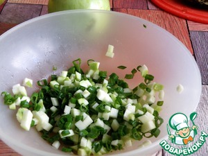 Сочное кисло-сладкое яблоко нарезать мелкими кубиками и полить лимонным соком. Зеленый лук мелко нашинковать.