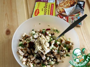 Заправить салат майонезом с горчицей, добавить черный перец по вкусу и хорошо вымешать. Масса ни в коем случае не должна быть излишне влажной, майонез должен только скрепить продукты между собой.